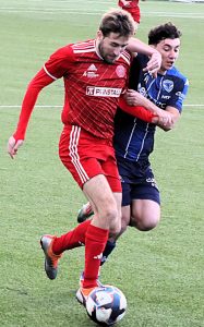 Le début de rencontre est à l’avantage des locaux qui utilisent bien le ballon et coordonnent bien leurs déplacements. Sans maîtriser le jeu, nos rouges défendent, mais ne sont dans l’ensemble pas inquiétés. Avec le temps, nous utilisons moins le jeu long et plus les relais. Antonin croit alors ouvrir le score sur la réception d’un centre, mais l’arbitre de touche ne voit pas le ballon rebondir derrière la ligne après avoir touché la transversale et laisse l’action se poursuivre. Dans la continuité, Tommy se fait sévèrement expulser. La reprise se passe sur un faux rythme, et cette fois, c’est Rudy qui voit rouge.