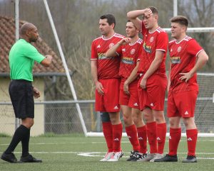 Comme nous nous y attendions, les locaux imposent un jeu très physique et nous punissent d’entrée. A la 4ème minute, l’un joueur adverse déclenche une frappe imparable de 40 mètres : incroyable ! Nous nous trouvons alors dans les pires dispositions pour entamer ce match. En manque d’inspiration sur un terrain en herbe, nous abusons du jeu long et de renversements de jeu mal venus. Notre jeu n’est pas assez incisif et nous manquons de percussion. Nous nous remettons à quelques différences faites par Quentin Philibert et quelques coups de pied arrêtés pour créer le danger. Malheureusement, nous ne sentons pas suffisamment les coups pour revenir au score. Même si une tête rageuse d’Emilien Chanel semblait avoir dépassé la ligne.