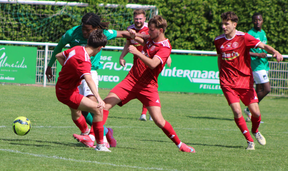 Face à une équipe cohérente et de qualité, nos joueurs font front dès les premières minutes afin de ne pas encaisser de buts au vu de la débâcle des précédents week-ends. Appliqués et bien en place, nous laissons peu d’opportunités à notre adversaire. Nous réussissons à exploiter les espaces laissés dans leur dos, mais sans nous montrer suffisamment dangereux par manque de justesse technique. A force d’appuyer et d’exploiter la largeur du terrain, Feillens trouve la faille même si la position au départ nous semble plus que questionnable. Le caractère de notre groupe nous permet de revenir sur coup de pied arrêté par l’intermédiaire de Théo Gleyze à la suite d’une magnifique reprise. La mi-temps est sifflée sur le score de 1 à 1.