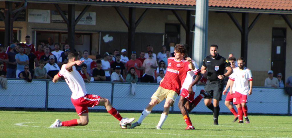 Chacun aura été au diapason d’un collectif retrouvé nous permettant d’obtenir une victoire collective. Solide, nous arriverons rapidement à nous monter dangereux en attaquant les espaces libres dans le camp adverse. Le premier but du match sera inscrit par Sylvain Morel bien servi dans son couloir par Raph’ Moiraud. Sylvain ne se fera pas prier cette fois pour s’engouffrer dans la surface et marquer petit filet opposé. Nous pensons avoir fait le plus dur tant nous ne laissons que peu de situations notre adversaire du jour. Malheureusement à la suite d’un coup de pied arrêté, une frappe contrée permettra aux Oyonnaxiens de recoller au score. La mi-temps est sifflée sur le score de 1 partout comme la semaine dernière.